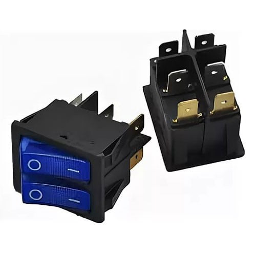 Выключатель клавишный 250V 15А (6с) ON-OFF синий с подсветкой ДВОЙНОЙ предназначен для коммутации электрических цепей переменного тока напряжением до 250В. Клавишные (Рокерные) выключатели применяются в качестве комплектующих изделий различного электрооборудования (в сетевых фильтрах и удлинителях, аудио-оборудовании, блоках питания, электроустановках на различных производствах, автомобилях, и многих других местах). Такой клавишный переключатель имеет два положения и две клавиши, что позволит раздельно коммутировать контактные группы. Принцип действия основан на перемещении клавиши в одну из позиций. Для переключения в нужное положение требуется приложить некоторые усилия на клавишу. Монтаж осуществляется без применения винтов на плоских панелях толщиной от 0.8мм до 3мм. Подключение контактов осуществляется плоской клеммой 6.6мм, либо с помощью пайки.Основные характеристики: