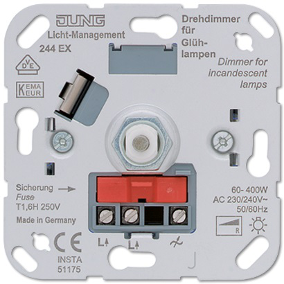 Диммер поворотный 60-400 Вт для ламп накаливания Jung ECO Profi механизм - это устройство, предназначенное для регулировки яркости света в помещении. Данный диммер имеет мощность от 60 до 400 Вт, что позволяет использовать его с различными типами ламп накаливания.Механизм диммера выполнен в стиле Jung ECO Profi, что гарантирует его высокое качество и надежность. Он оснащен поворотным механизмом, который позволяет легко и удобно регулировать яркость света.