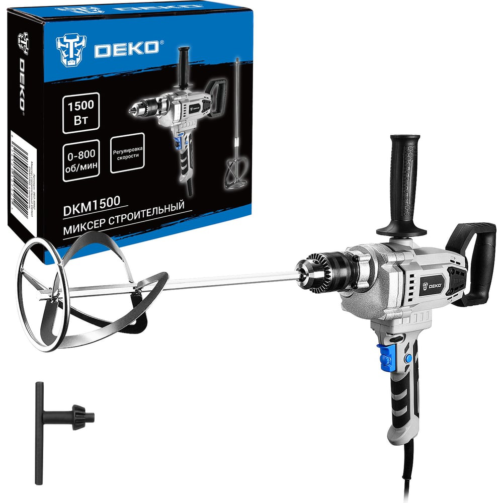 Миксер строительный DEKO DKM1500 предназначен для перемешивания красок, клеев, герметиков, лаков, штукатурки, строительных растворов и смесей.Технические характеристики:Напряжение - 230 ВЧастота - 50 ГцМощность - 1500 ВтЧисло скоростных интервалов - 1Скорость вращения шпинделя - 0-800 об/минРазмер патрона - ½Максимально допустимый диаметр перемешивающей насадки - 120 ммКласс безопасности - IIТип электродвигателя - однофазный, коллекторный с двойной изоляциейСтепень защиты - IP20