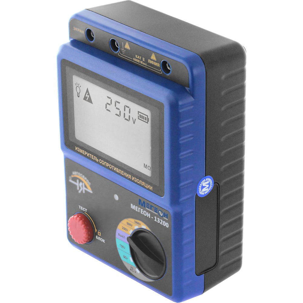 Измеритель сопротивления изоляции-мегаомметр МЕГЕОН 13200 к0000011555 – простой и практичный в эксплуатации прибор. Используется для измерения сопротивления изоляции и напряжения между щупами. Дисплей с подсветкой облегчает считывание данных в слабоосвещенных местах. После 10-ти минут бездействия мегаомметр автоматически отключается, что позволяет экономить заряд батарей. Время непрерывной работы от элементов питания составляет 15 часов. Прибор внесен в государственный реестр СИ, под номером 74507-19, срок периодической поверки составляет два года. Тестовое напряжение: 50, 100, 250, 500, 1000 В.