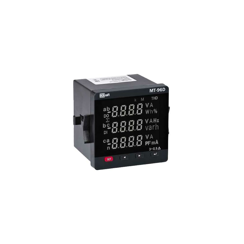Цифровой мультиметр DEKraft мт-96d 96x96мм, трехфазный, вход 600в 5а, rs485, lcd-дисплей 51428DEK предназначен для измерения электрических величин в цепях переменного тока частотой 50 Гц. В этой серии измерительных приборов модульной конструкции используется технология дискретизации переменного тока и цифровой обработки сигналов. Прибор удобен в установке, подключении и обслуживании. Он может быть запрограммирован для установки параметров на месте, реализуя сеть различных ПЛК и компьютерных коммуникационных программ в промышленности. Тип сети: Однофазная, трехфазная Перенапряжение: Постоянное: 1.2×Un; Пиковое: 2×Un в течение 1с Перегрузка по току: Постоянная: 1.2×In; Пиковая: 10×In в течение 5с Характеристики контактов: 3A/250В AC; Настраиваемые значения: Значения максимального, минимального значения срабатывания и значения гистерезиса Способ вывода: Переключающий контакт или сигнализация Интерфейс связи: RS485 Протокол связи: MODBUS-RTU Скорость передачи: 1200, 2400, 4800, 9600 бод Бит четности: Чет, нечет, нет Потребляемая мощность:< 5ВА Вход и вспомогательное питание: >2кВ 50 Гц / 1 мин Вход и выход: >2кВ 50 Гц / 1 мин Выход и вспомогательное питание: >2кВ 50 Гц / 1 мин Сопротивление изоляции: Между входами, выходами и корпусом прибора >100 МОм