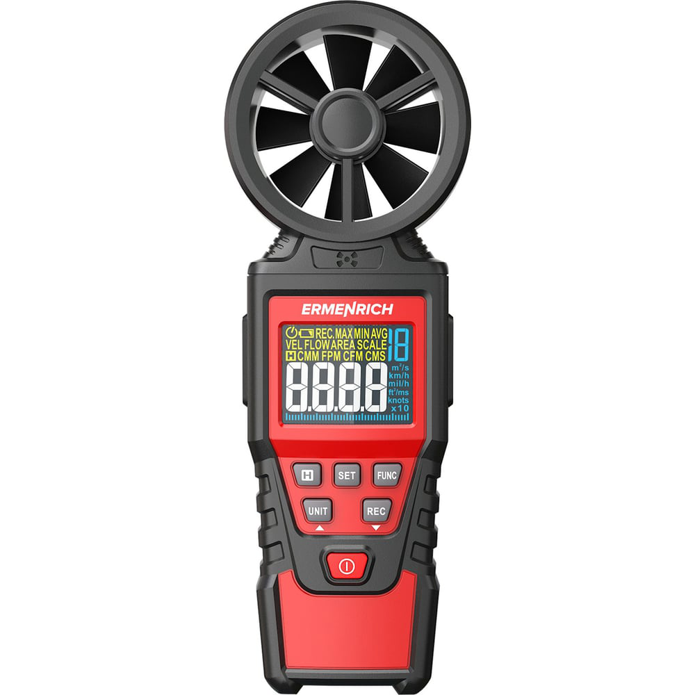 Анемометр Ermenrich Seek DN20 – цифровой прибор для измерения скорости воздушного потока. Компактные размеры и встроенный крыльчатый датчик позволяют проводить замеры оперативно, как на улице, так и в помещении. Цветной экран с подсветкой дает возможность работать в условиях с плохим освещением. Анемометр может фиксировать текущее значение измерений, а также сохраняет информацию о максимальных, минимальных и средних значениях. Доступен выбор единиц измерения: мили в час, м/с, км/ч, узлы, фут/с, фут/м, CFM. Индикатор низкого заряда батареи и функция автоотключения позволяют наиболее экономно расходовать энергию. Питание при этом осуществляется от комплекта из трех батареек типа ААА (приобретаются отдельно).