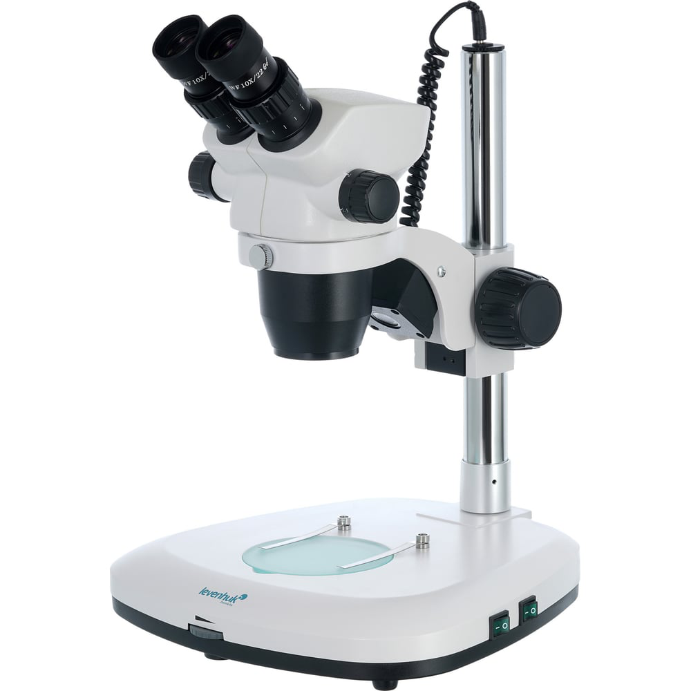 Бинокулярный микроскоп Levenhuk ZOOM 1B 76056 можно использовать для изучения крупных образцов любой степени прозрачности. Он позволяет использовать и проходящий, и отраженный свет в наблюдениях по методу светлого поля. Хорошо подойдет для профессиональной работы часового мастера, ювелира, геолога, зоолога, ботаника, филателиста, нумизмата. Благодаря простоте управления его можно использовать и для любительских исследований. Бинокулярная насадка позволяет вести наблюдения сразу обоими глазами – это снижает нагрузку на зрение и делает длительную работу с образцами более удобной. Визуальная часть имеет наклон, всю насадку можно поворачивать на 360°. В комплектацию включены широкопольные окуляры с 10-кратным увеличением, которые обеспечивают хороший угол обзора. Объектив панкратический, а значит, кратность микроскопа можно изменять плавно, а не ступенчато. Общее увеличение оптики составляет от 7 до 45 крат. Есть грубая настройка резкости. Комбинированная подсветка представляет собой два светодиода, расположенных сверху и снизу от предметного столика. Яркость подсветки можно регулировать, для питания светодиодов используется сеть переменного тока. Насадка, штатив и основание микроскопа сделаны из прочного металла, поэтому Levenhuk ZOOM 1B – это надежный и долговечный прибор.