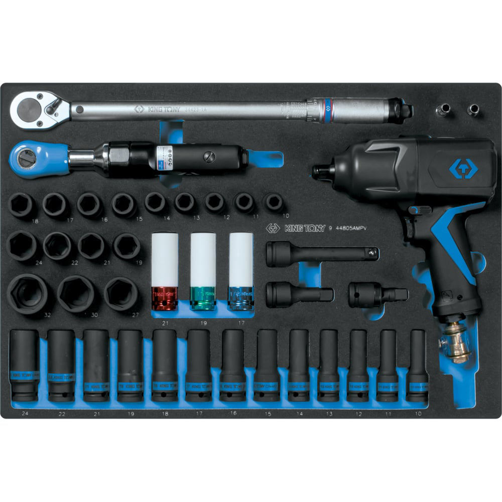Набор пневмоинструмента KING TONY принадлежностями, ложемент, 41 предмет 9-44805AMPV подходит для разных работ. Приборы выполнены из прочной хромомолибденовой стали, благодаря чему набор имеет долгий срок службы. Ложемент с инструментом адаптирован для расположения на инструментальной тележке. Работа на сжатом воздухе имеет больший рабочий ресурс по сравнению с электроинструментом.