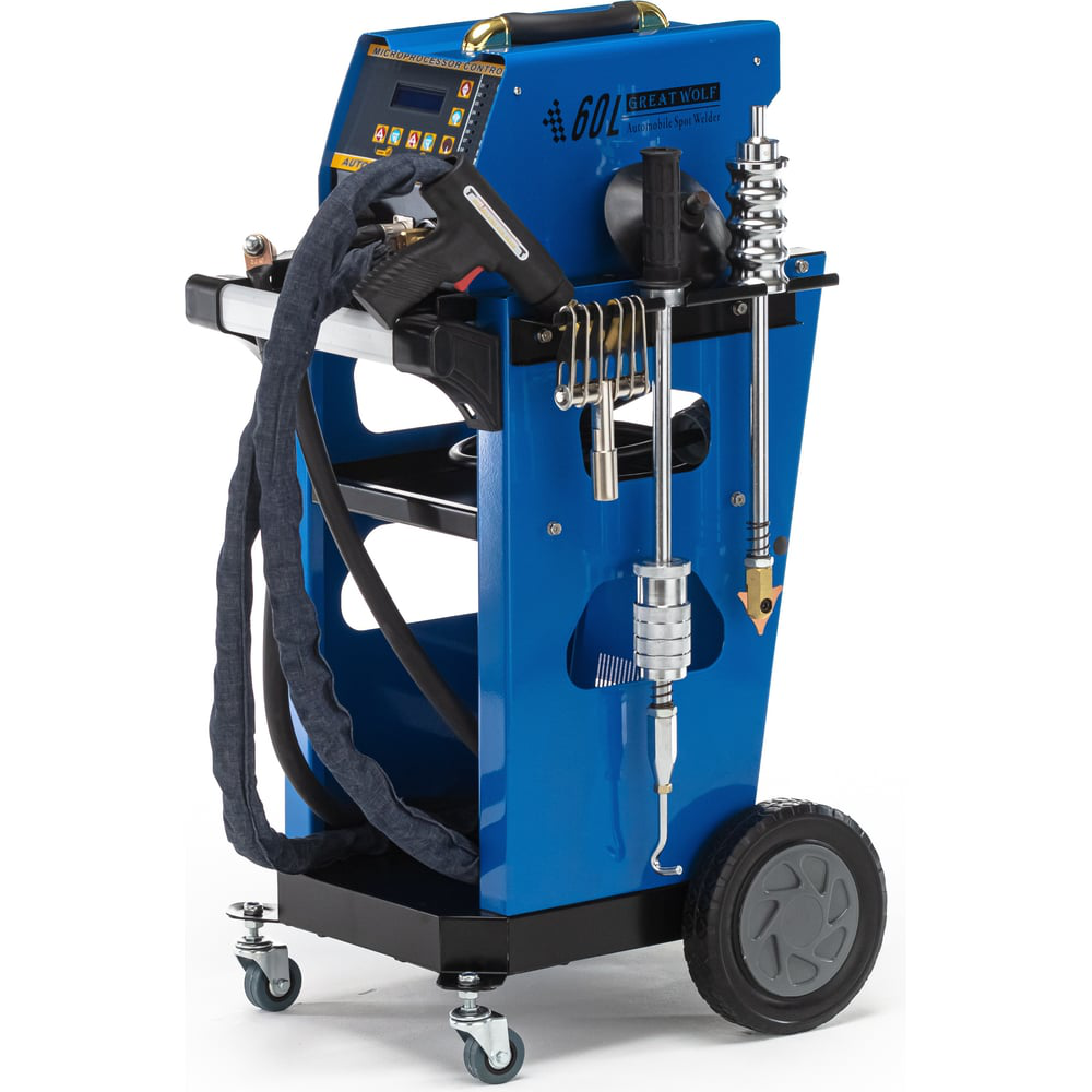 Споттер Great Wolf GW-60L 220 для контактной точечной сварки и выпрямления стальных поверхностей с микропроцессорным управлением и автоматическим вводом параметров сварки в зависимости от инструмента и толщины металлического листа. Понятный дисплей и кнопочная панель обеспечивают удобное использование аппарата. Благодаря транспортировочной тележки оборудованной ручкой и маневренными колесами существенно повышается мобильность устройства. Применяется в кузовных цехах авторемонтных предприятий.