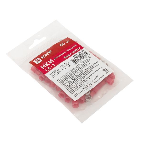 Наконечник кольцевой НКИ 1.25-3 медный луженый, под опрессовку, крепеж М3 (Ø 3,3мм), хвостовик изолированный ПВХ [красный], внут.Ø 4мм, S.0,5-1,25мм², (упк.50шт) Наконечники кольцевые изолированные серии НКИ предназначены для оконцевания многожильных (гибких) медных проводов и используются при монтаже электрических узлов, где предусмотрено соответствующее контактное соединение на основе винтовой фиксации. Кольцевые наконечники используются для стационарных подключений к электрооборудованию