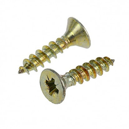 Саморез универсальный, покрытие - желтый цинк. Применяется для прямого крепления различных изделий к деревянным конструкциям и к прочным материалам (бетон, кирпич, камень) через дюбель. Также применяются совместно с любыми видами пластиковых дюбелей (для полнотелых и пустотелых конструкций), для сборки деревянных конструкций и металлических конструкций (с предварительным сверлением). Желтый цинк считается более прочным покрытием. Часто применяется в отделке в местах, где шляпка остается видимой.