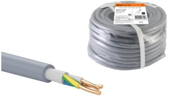 3-х одножильных медных проводников сечением 2,5 мм. кв., каждый из которых покрыт поливинилхлоридным диэлектриком разных цветов — синий (нейтраль провод N), черный, серый или коричневый (фазные), зелено-желтый (заземляющий проводник);