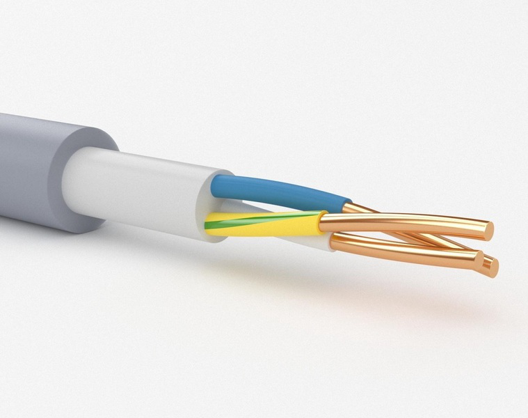 3-х одножильных медных проводников сечением 4 мм. кв., каждый из которых покрыт поливинилхлоридным диэлектриком разных цветов — синий (нейтраль провод N), черный, серый или коричневый (фазные), зелено-желтый (заземляющий проводник);