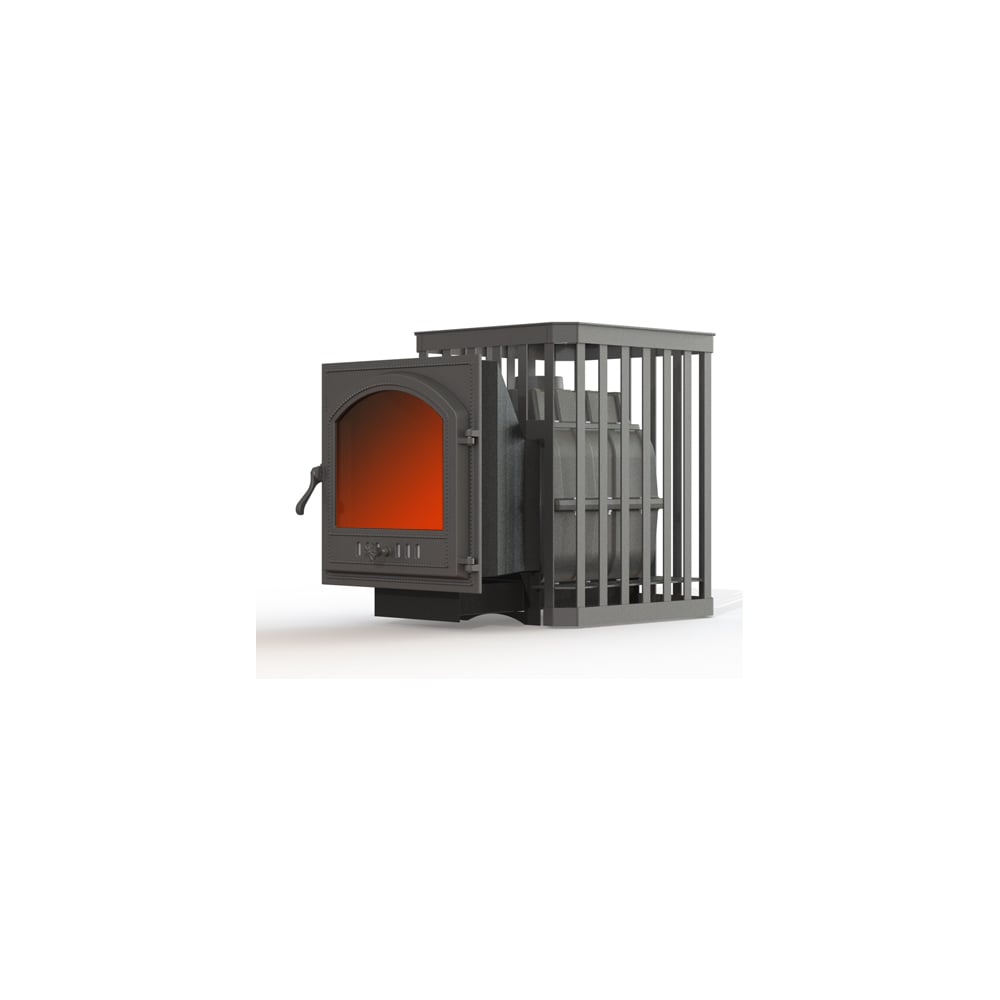 Печь предназначена для отопления парильных помещений 10-18м2. Топка печи чугунная. Каменка в виде сетки из кованной стали. Выносной канал 30см для топки печи из смежного помещения. Топочная дверца чугунная стандартная К505 Fireway, размер 490х490 мм. Загрузка дров фронтальная. Диаметр дымохода 115 мм. Расположение дымохода сверху. Отделка антрацит. Размер стекла 362х313х4 мм, стекло имеет радиус по арке.
