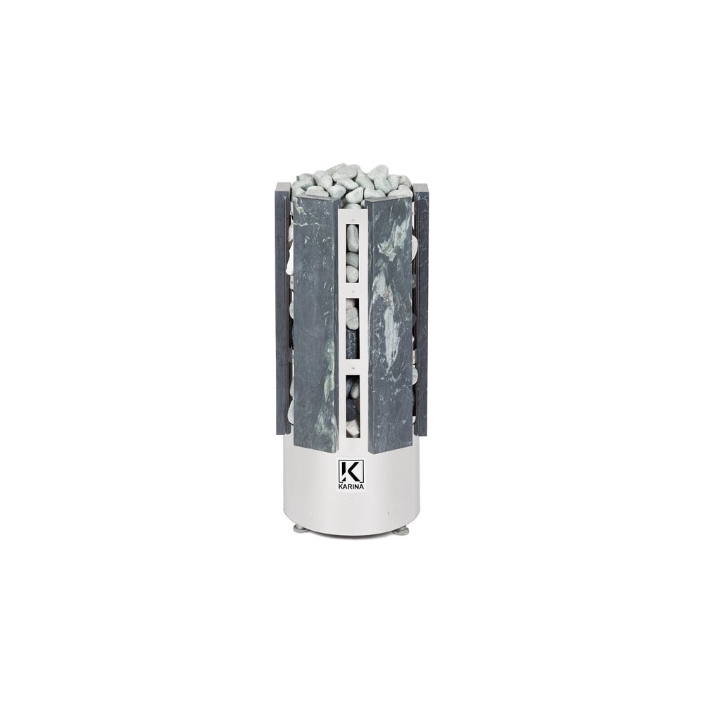 Электрокаменка Karina Forta 6 Талькохлорит предназначена для парных объемом до 8м3. Печь выполнена в напольном варианте и цилиндрической формой дополненной плитами из натурального камня Талькохлорита. Напряжение питания - 220/380В. Данная модель имеет 3 тэна, расположенных в виде треугольника. В центре внизу расположен бак для воды емкостью 3 л, который является парогенератором. Выше парогенератора имеется емкость под мелкие камни объемом 2.5 л, вмещающая 5 кг мелкого камня, называемая закрытой каменкой с воронкой для подачи воды и получения мелкодисперсного пара.Если в парогенератор не заливать воду, то каменка разогреет парную до высокой температуры (100 -120°C) с относительной влажностью воздуха 10-12% - режим сухой финской сауны. Если залить воду в парогенератор, то при разогреве парной вода будет испаряться и увлажнять воздух до режима русской бани (60-70°C и 40-50% влажности). В обоих случаях возможно использование закрытой каменки, которая дополнительно прибавит мелкодисперного необжигающего пара, от которого вы получите удовольствие находясь в парном помещении.Управление электропечью осуществляется с помощью выносного пульта, который не входит в комплектацию.Все корпусные элементы печи выполнены из нержавеющей стали. Нагревательный элемент - ТЭН диаметром 10мм. Наружный кожух каменки дополнительно облицован плитами из Талькохлорита толщиной 40мм, что придает еще большую теплоемкость и меньшее излучение от металлических элементов, которые выжигают воздух в парной.