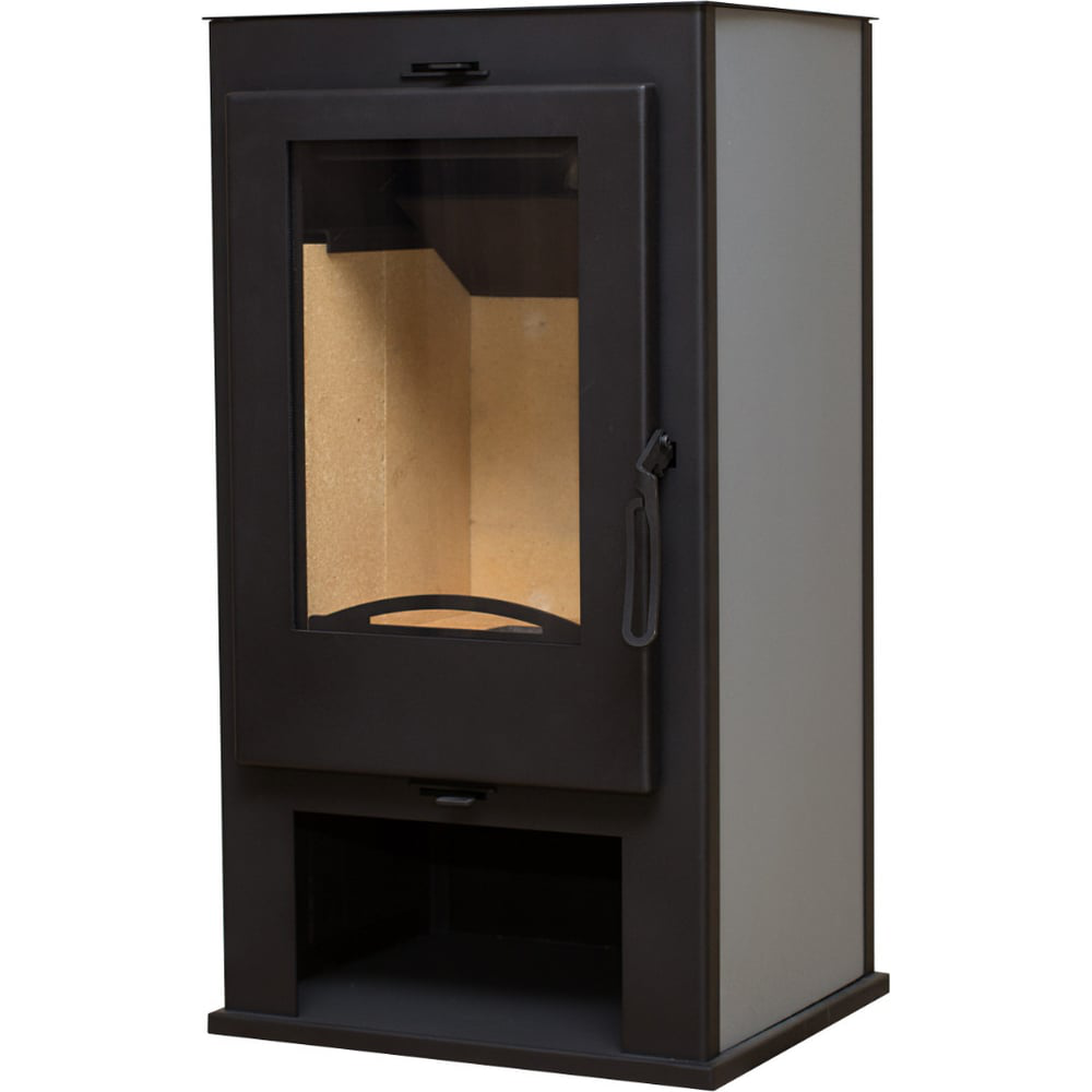 Пристенная высокая дизайнерская печь с панорамным обзором. Обзор огня с трех сторон. Оборудована большой остекленной дверкой выполненной в одной плоскости с корпусом печи и с двумя боковыми стеклами. Дверка высотой 600 мм и боковые стенки выполнены с небольшим радиальным изгибом. Ручка открывания утоплена внутрь дверки. Подсоединение к дымоходу сверху или сзади.