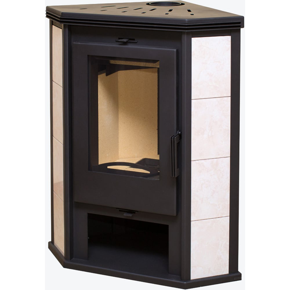Компактная угловая печь с диаметром дымоходного патрубка 115 мм. Печь оснащена системой «регулируемого вторичного дожига». Дополнительная конвекция предусмотрена на верхней крышке печи. Идеально подходит для обогрева небольшого загородного домика площадью 30-60 м2. Размер поленьев 25-27 см. Подсоединение к дымоходу сверху.