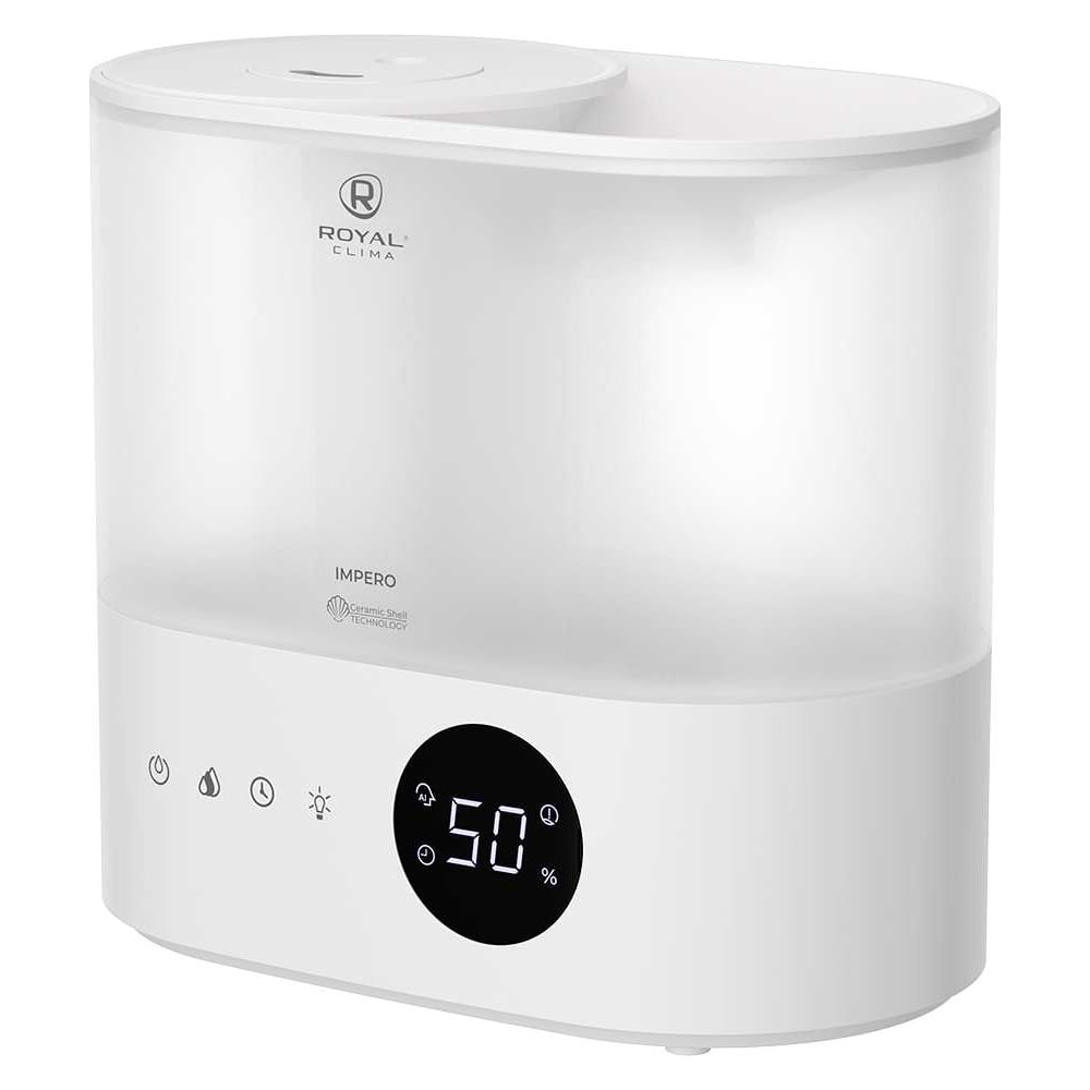 IMPERO - ультразвуковой увлажнитель воздуха от ROYAL CLIMA. Практичный и лаконичный прибор для увлажнения воздуха в помещении.На фронтальной части прибора расположена электронная панель управления и LED-дисплей для визуальной индикации работы. Умный режим автоматического контроля влажности будет поддерживать комфортный микроклимат на протяжении всей работы устройства. Возможна установка таймера от 1 до 12 часов. Многоцветная подсветка резервуара для воды создаст уют в помещении, возможен выбор 1 из 7 цветов.