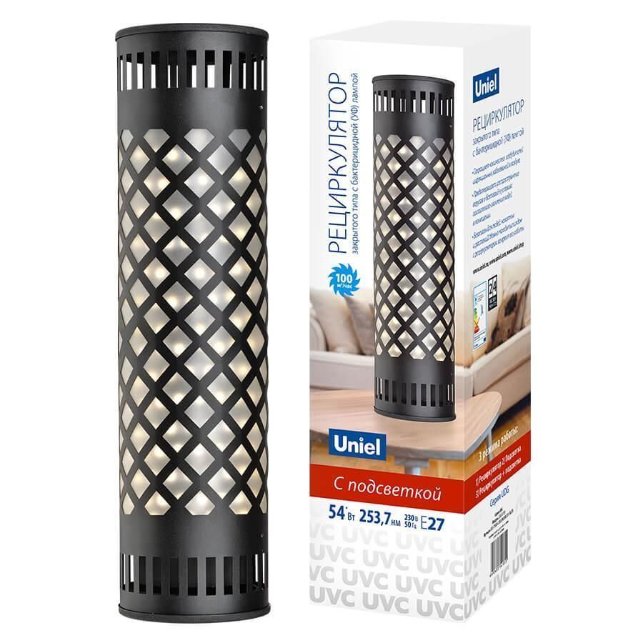 Расширенная гарантия на товар составляет 2 года. поставщик рекомендует использовать лампы накаливания с цоколем E27 для освещения площади 3 м2. Ультрафиолетовый бактерицидный рециркулятор Uniel UDG-V100A UVCB/4000K D01 Black UL-00007821 в современном стиле используется в интерьере Для офиса с установкой На стол.