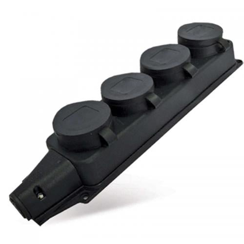 Четверная каучуковая колодка с заглушками - силовой разъем для создания надежных и защищенных соединений. Изделие дает возможность подключения одновременно трех электроприборов вне помещения, например: строительного оборудования, электроинструмента, приборов электроснабжения и пр.