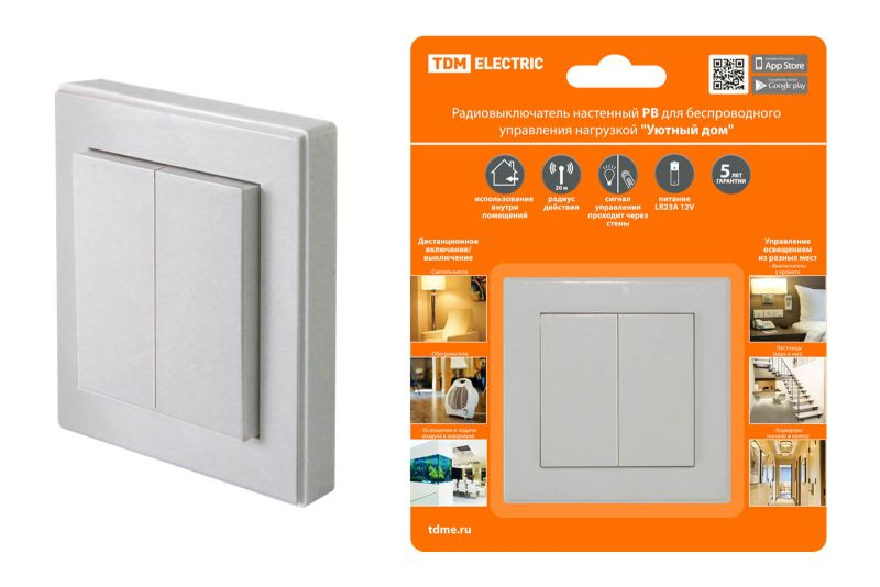 Радиовыключатель настенный РВ2 (2 клав.) для беспроводного управления нагрузкой Уютный дом TDM - это удобное устройство, которое позволяет беспроводно управлять освещением и другими электрическими устройствами в вашем доме. С двумя клавишами для управления, этот радиовыключатель легко устанавливается на стену и интегрируется в интерьер помещения. Благодаря технологии радиосвязи, вы можете управлять нагрузкой с любого места в доме, что делает вашу жизнь более комфортной и уютной.