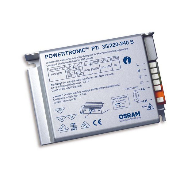 ЭПРА для металлогалогенных ламп OSRAM PTi 35W S - это электронное устройство, предназначенное для питания и управления металлогалогенными лампами мощностью 35 Вт. Этот балласт обеспечивает стабильное питание лампы, увеличивает ее срок службы и обеспечивает высокую эффективность работы. Устройство OSRAM PTi 35W S легко устанавливается и подходит для использования в различных областях, где требуется освещение высокого качества и надежность.