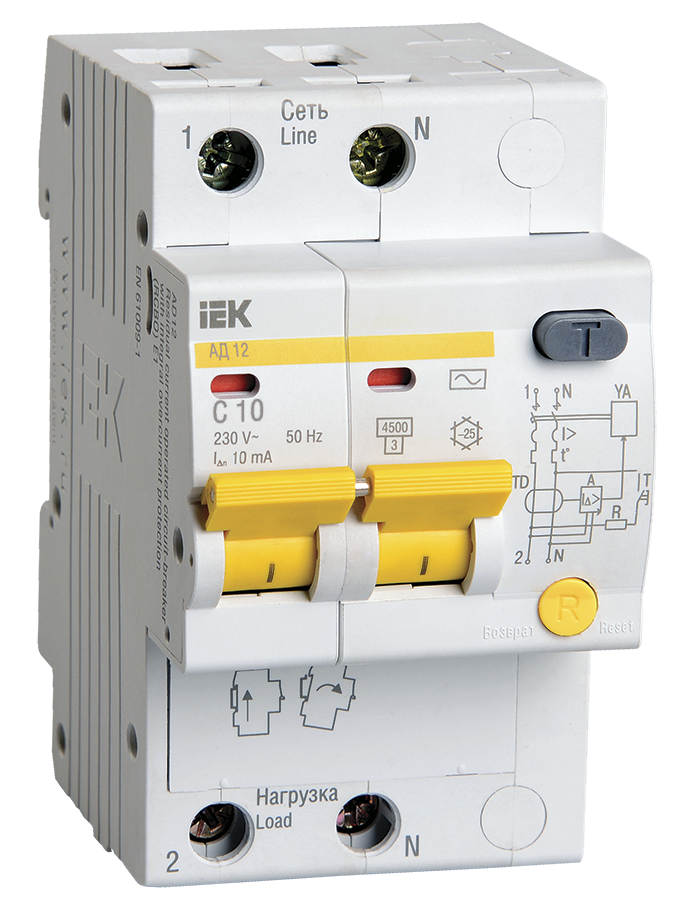 Быстродействующие защитные выключатели обеспечивают: в исполнении с уставками срабатывания 10 и 30 мА: - защиту людей от поражения электрическим током при прямом непреднамеренном прикосновении к токоведущим частям электрооборудования; в исполнении с уставками срабатывания 100 и 300 мА: – защиту от пожара из-за возгорания изоляции токоведущих частей; – защиту от перегрузки и короткого замыкания; – защиту от недопустимого повышения напряжения сети (АД12М). В изделиях предусмотрена индикация срабатывания от дифференциального тока, а для АД12М также светодиодная индикация включенного состояния. АД12М сохраняет работоспособность при снижении напряжения электрической сети до 110 В. В качестве коммутационных аппаратов в изделиях использованы выключатели автоматические ВА47-29 новой серии.